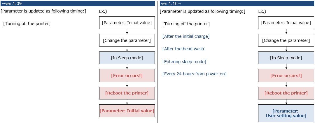 - Parameter changes are now stored immediately after a change (where parameters were changed or an ink-charge was done a power failure occurred while the printer was put in sleep mode without any power-cycling, these changes were not properly stored into the internal parameters). This has now been fixed.