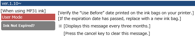 - Added user-notification to check the expiration date (in User mode: only functional when using MP31 inks)