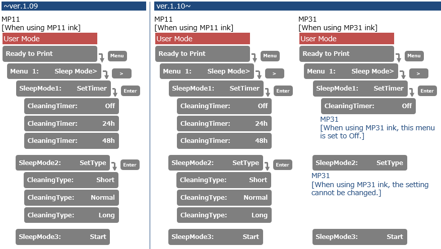 - Added Sleep Mode menu in User mode. Sleep mode is only active when using MP31 ink.