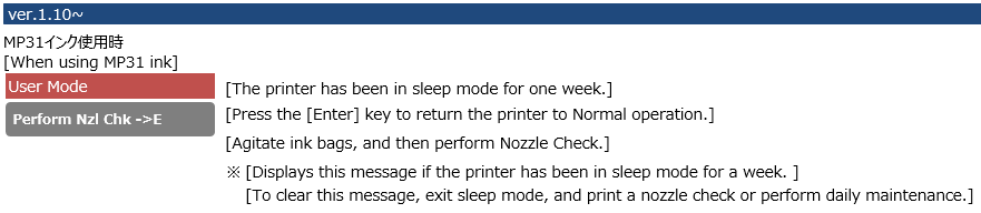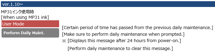- Added a message to prompt a user to perform daily maintenance (User mode: only when using MP31 ink)