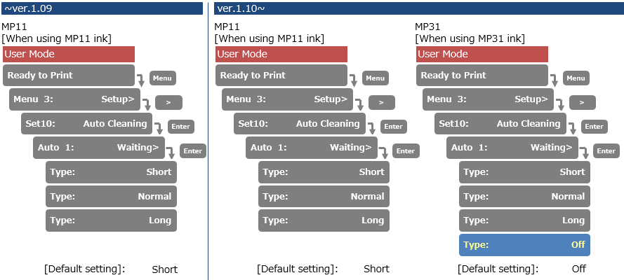 - Changed autocleaning menu during stand-by (User mode: Only when using MP31 ink)