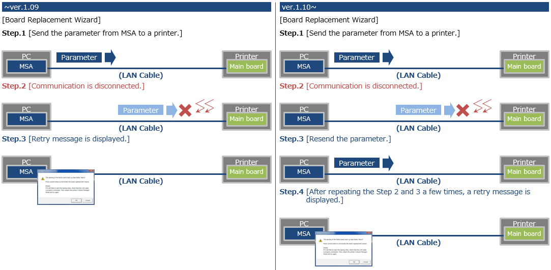 - When the network transfer was interrupted due to cable issues or bad contacts, the printer needed to be restarted in order to resolve the connectivity issue. When disconnections now occur, the printer will automatically retry to recover the connection within a time-span of 5 minutes before a timeout occurs