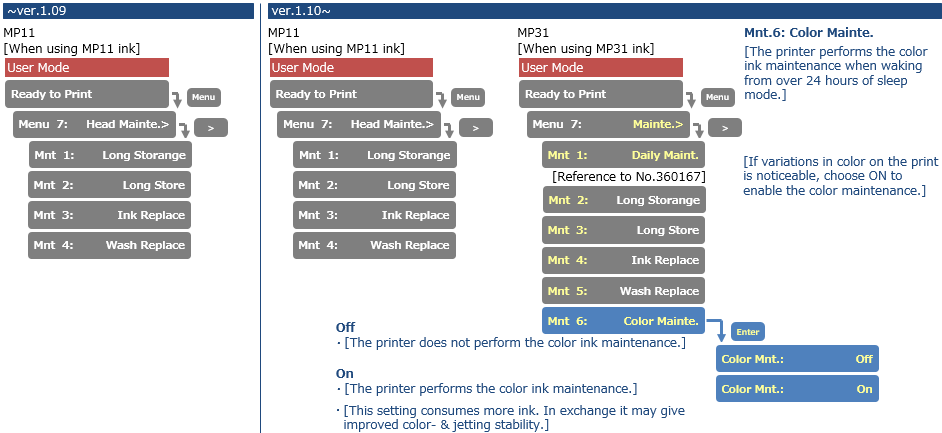 - Changed the Head Maintenance Menu (in combination with using MP31 inks).