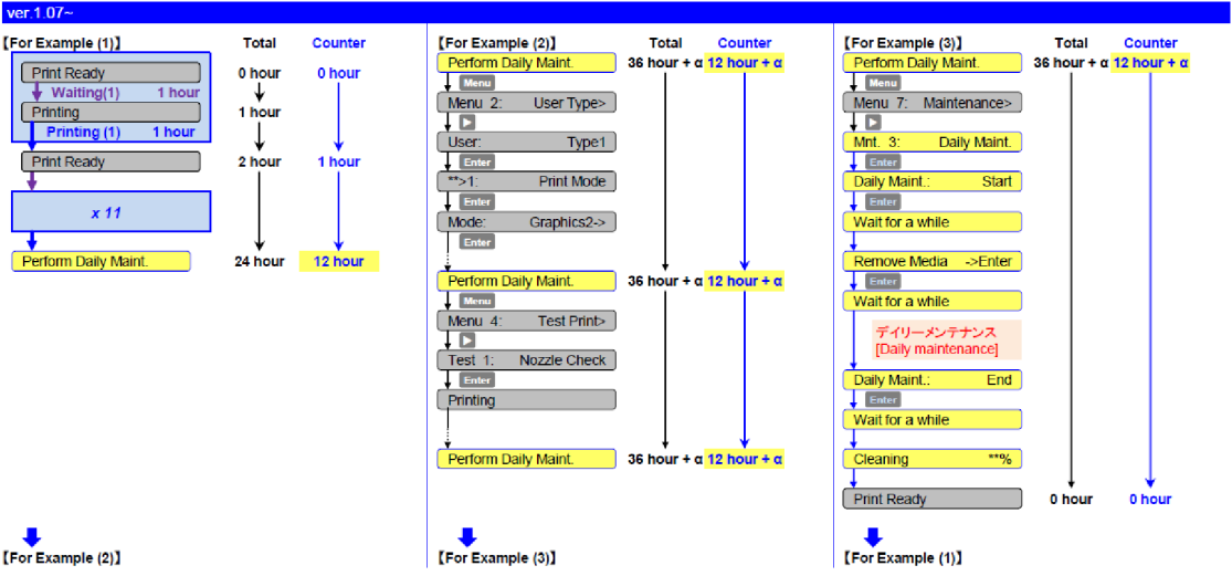 - Display the message to prompt users to perform the daily maintenance: when the total printing time reaches 12 hours, the message appears to prompt users to perform the daily maintenance