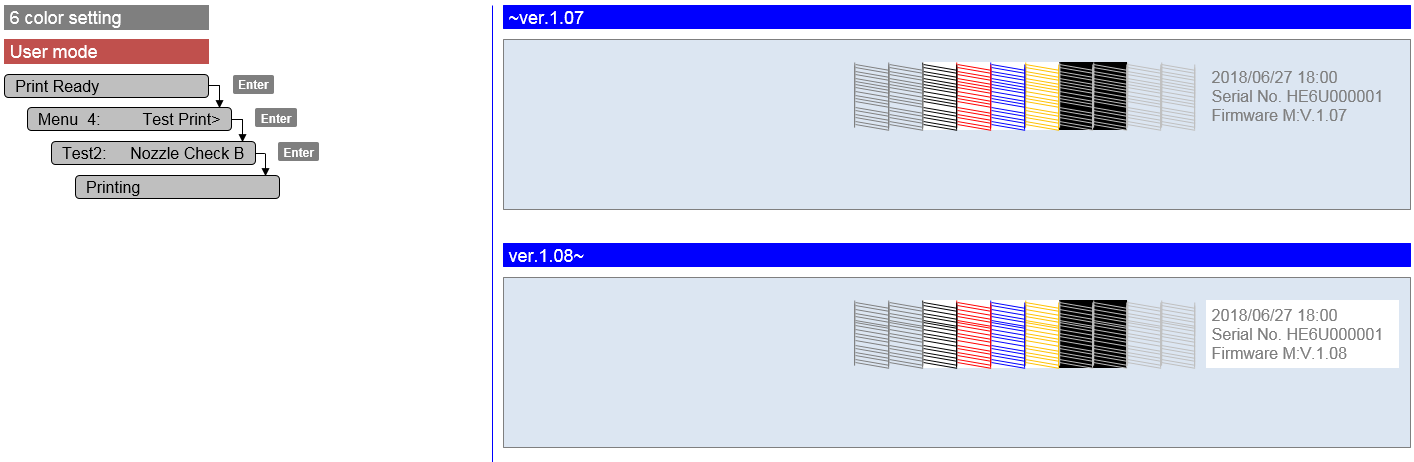 - If nozzle check (B) was executed in 6 colors, the printer information was printed in varnish. This has been exchanged with black.