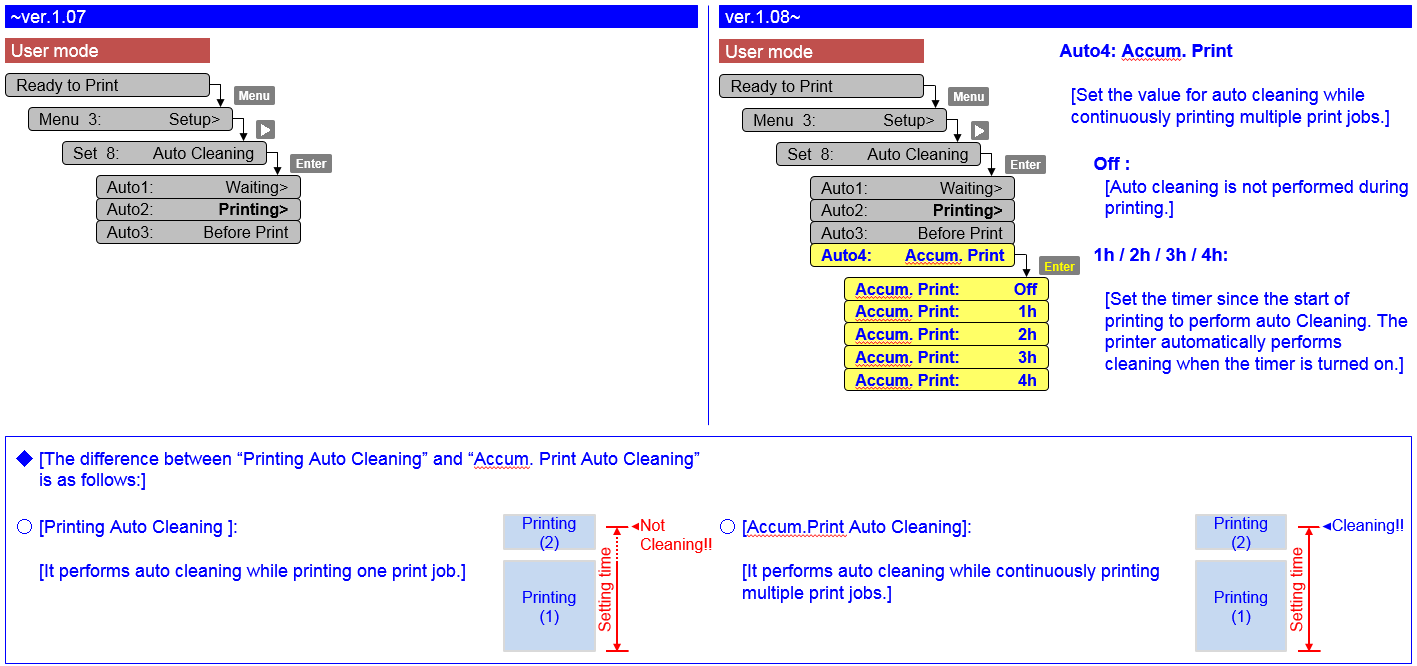 - Added the Accum. Print menu in Auto Cleaning menu [User mode].Perform the auto cleaning at each accumulated print time, when enable the Accum. Print Menu.