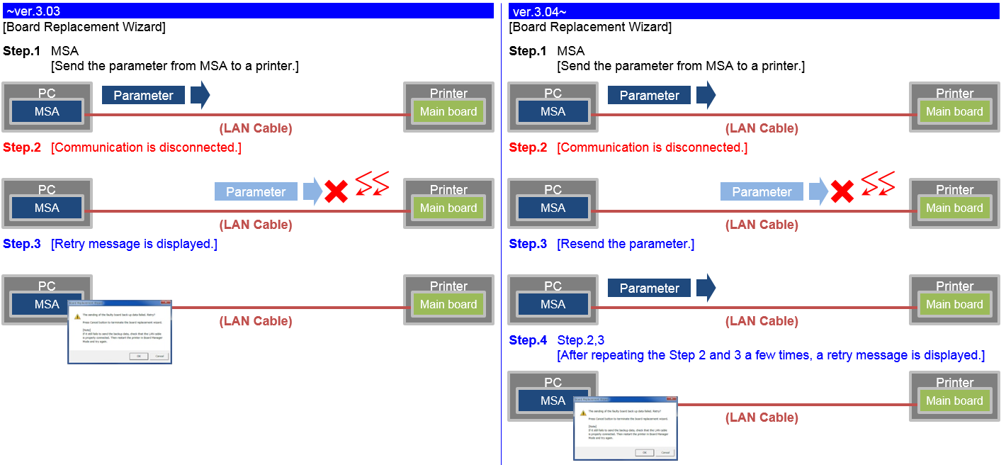 If the communication between MSA and the main board is cut off, MSA will automatically retry to sent the parameter.