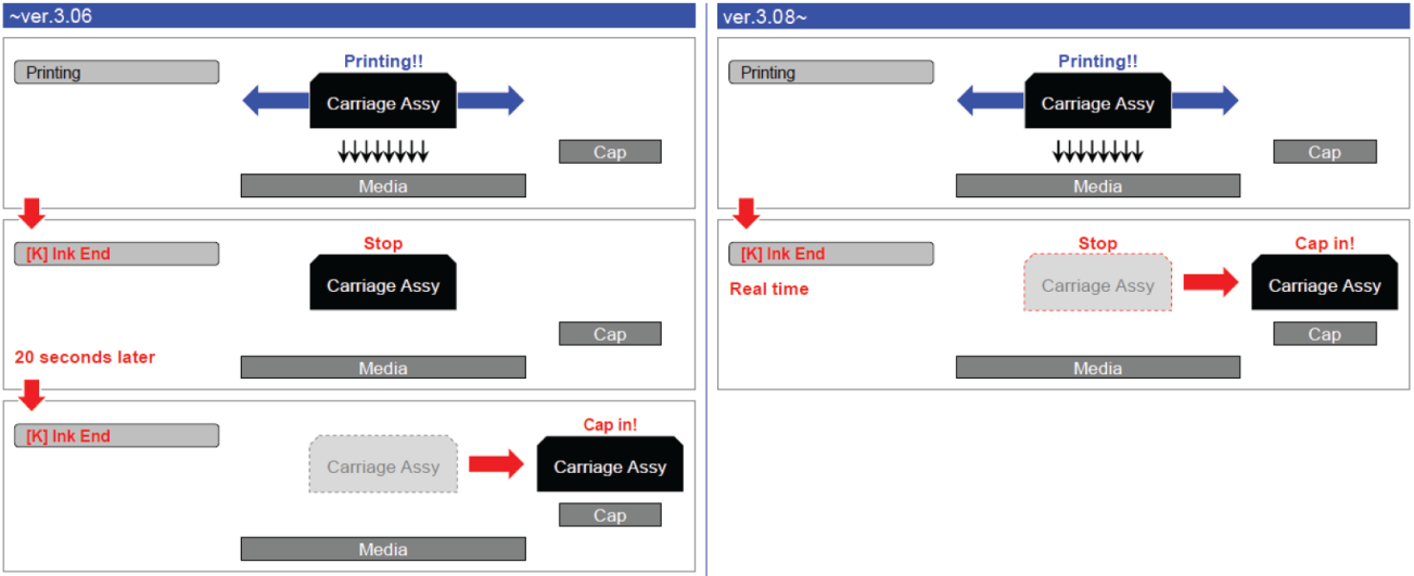 - When “ink end” occurs, the carriage caps immediately (there was a 20 seconds waiting time)