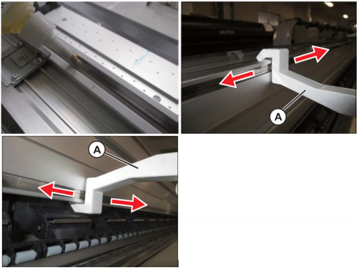 The Y-rail of a Mutoh printer contains 4 hardened steel strips, where the carriage-bearings are continuously rolling over.  Steel strips must be cleaned and lubricated on a regular basis in order to avoid preliminary wear and tear of strips and bearings.  A while ago we released Technical bulletin number 720 (dd 22 march 2017) "Replacement procedure for roller strips"