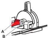 | Each print head has a cam, that can be turned up or down. The cam position defines the angle of the print head. To be able to turn the print head, don’t forget to loosen the 2 screws, retaining the print head. The print head is positioned against the cam B (see picture above). When turning, it will push the head forward. When the head needs a move backward you might need to “help” it a little by hand. The counter spring sometimes doesn’t apply enough force. | Example microscope view: The more the middle line is centred, the more accurate the “rough” adjustment will be. Use a very sharp media, which does not let inks bleed. Media with excessive “ink-bleeding” is NOT RECOMMENDED! For more information about the topic concerning “ink bleeding”, please check the FAQ at the end of this document. |