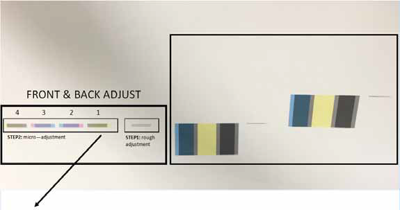 - When aligning the front & back micro-adjustment, it may occur that 1 of the 4 blocks are difficult to align: In the picture you can see that the bottom yellow lines are not properly aligned, between the black lines, especially in the bottom part. On top in the contrary, the yellow lines are perfectly centred between the black lines. Referring back to page 4 of this document, you should know that with the front & back micro-adjustment, there are 4 blocks. All the 4 blocks behave in exactly the same way when moving the print head front & back. If a nozzle-row of 1 block is not performing a straight-parallel jetting behaviour, try to compare the other 3 remaining blocks. Trust on it, that if these 3 remaining blocks are properly aligned, the block with the deviating nozzles will also be properly aligned.
