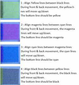 HEAD 1 = 6 Black nozzles HEAD 2 = 3 Yellow nozzles AIM: Move HEAD 2 Forward or Backward, in order to align the yellow lines, perfectly between the black lines: Please may we remind again that this alignment can only properly be done, with tack-sharp and non-bleeding print media. NEVER use classic printing vinyl where inks are excessively bleeding: | Moving these 3 yellow lines forward / backward is done as follows: Near HEAD 2, on the right side of the carriage there’s a big lever. This lever can move HEAD 2 forward or backward. In order to be able to move this head, don’t forget to loosen the right screws. HEAD 2 is pushed back by a spring. In some case the head doesn’t return back properly because the spring isn’t strong enough, when the lever is turned in the opposite direction. In this case you may need to give it a little hand’... |