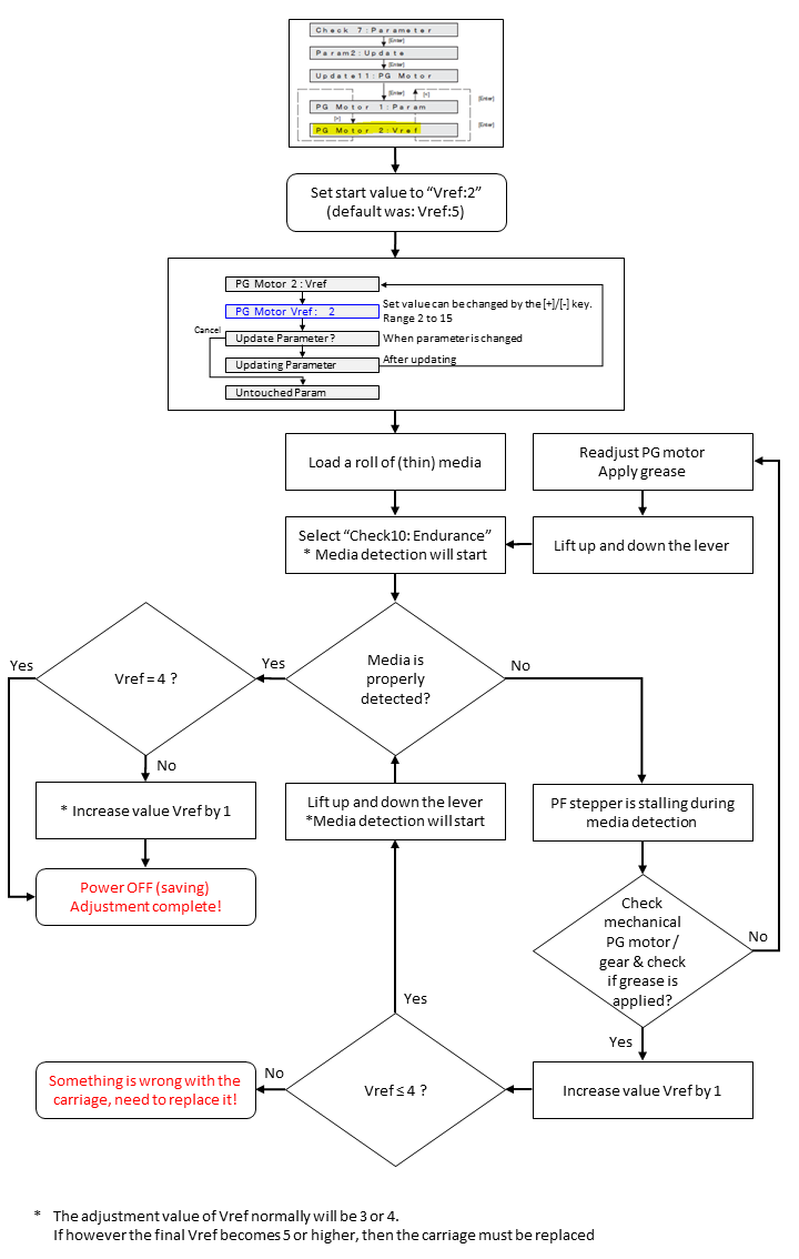 Please note that the normal default 'Factory setting' of Vref is 5. If after completion of this adjustment you end up with a final Vref value more than 4, then there is a suspicion that the Paper Gap stepper motor needs to 'abnormally hard' make the up/down vertical carriage-movement. In that case, there is something wrong with the carriage itself. In this case it is recommended to replace the complete carriage assembly with a new VJ-1638UH spare part carriage.