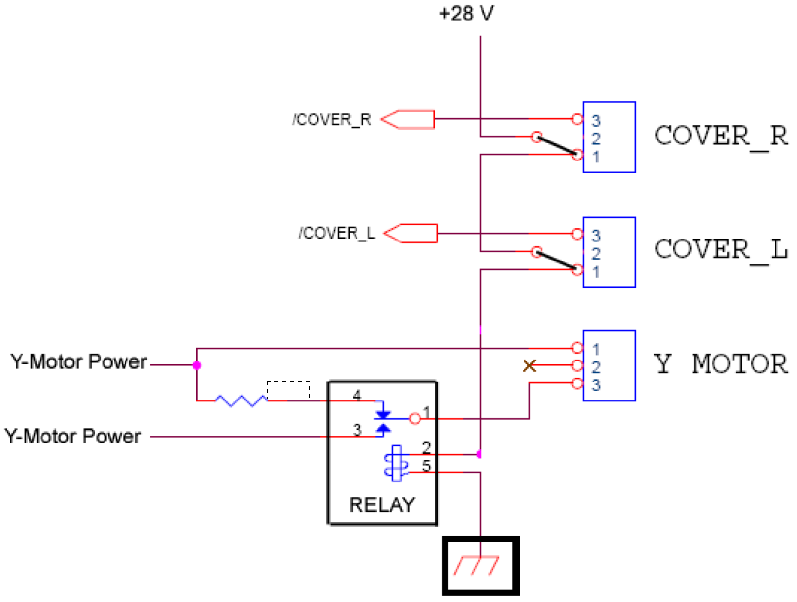 The power supplied to the CR motor is protected with a relay. This relay is directly soldered on the mainboard. The best way to identify the Y-motor relay is to listen to the "clicking" sound on the mainboard, when cover-switches open or close.