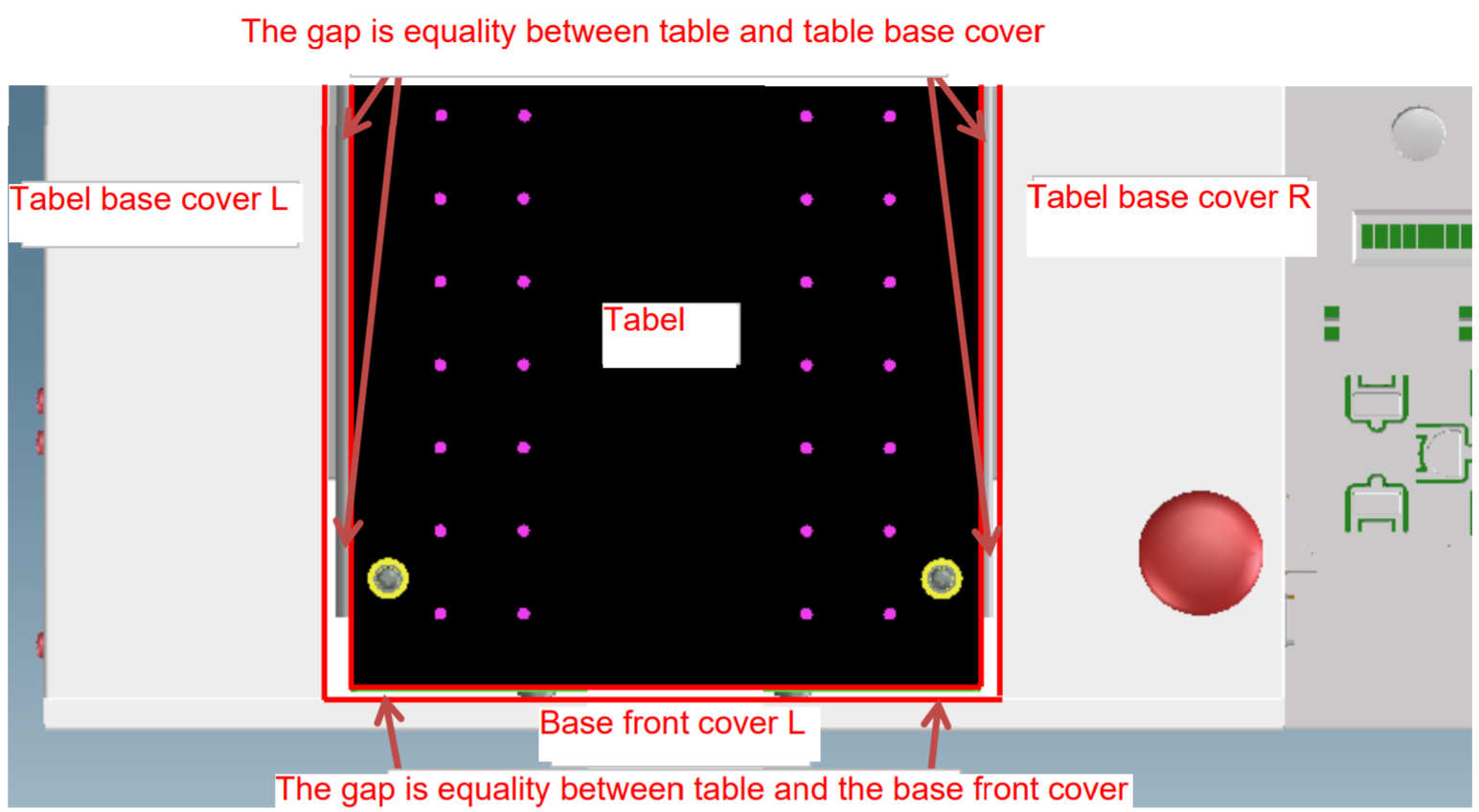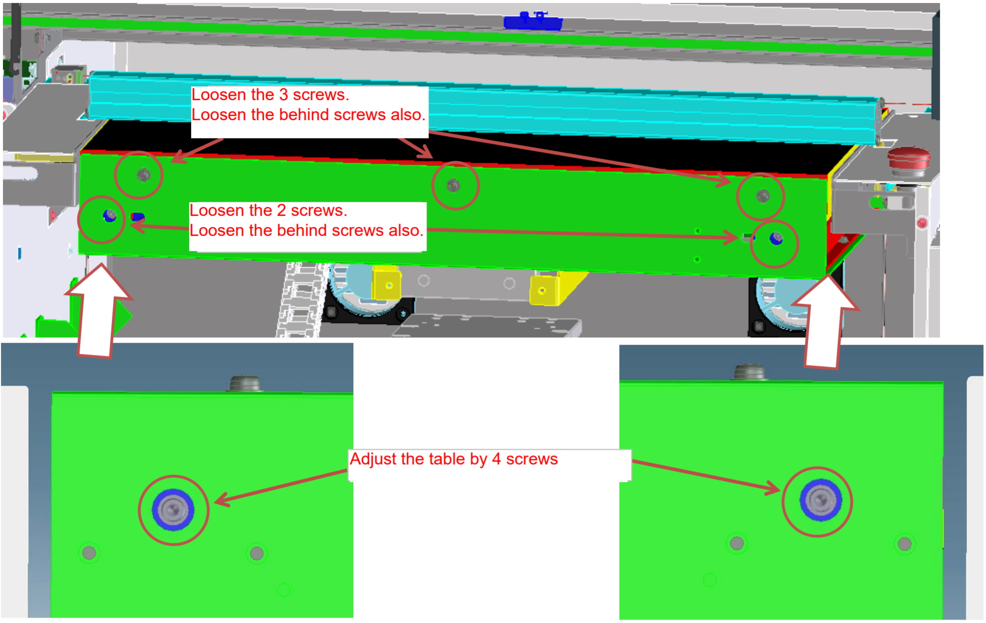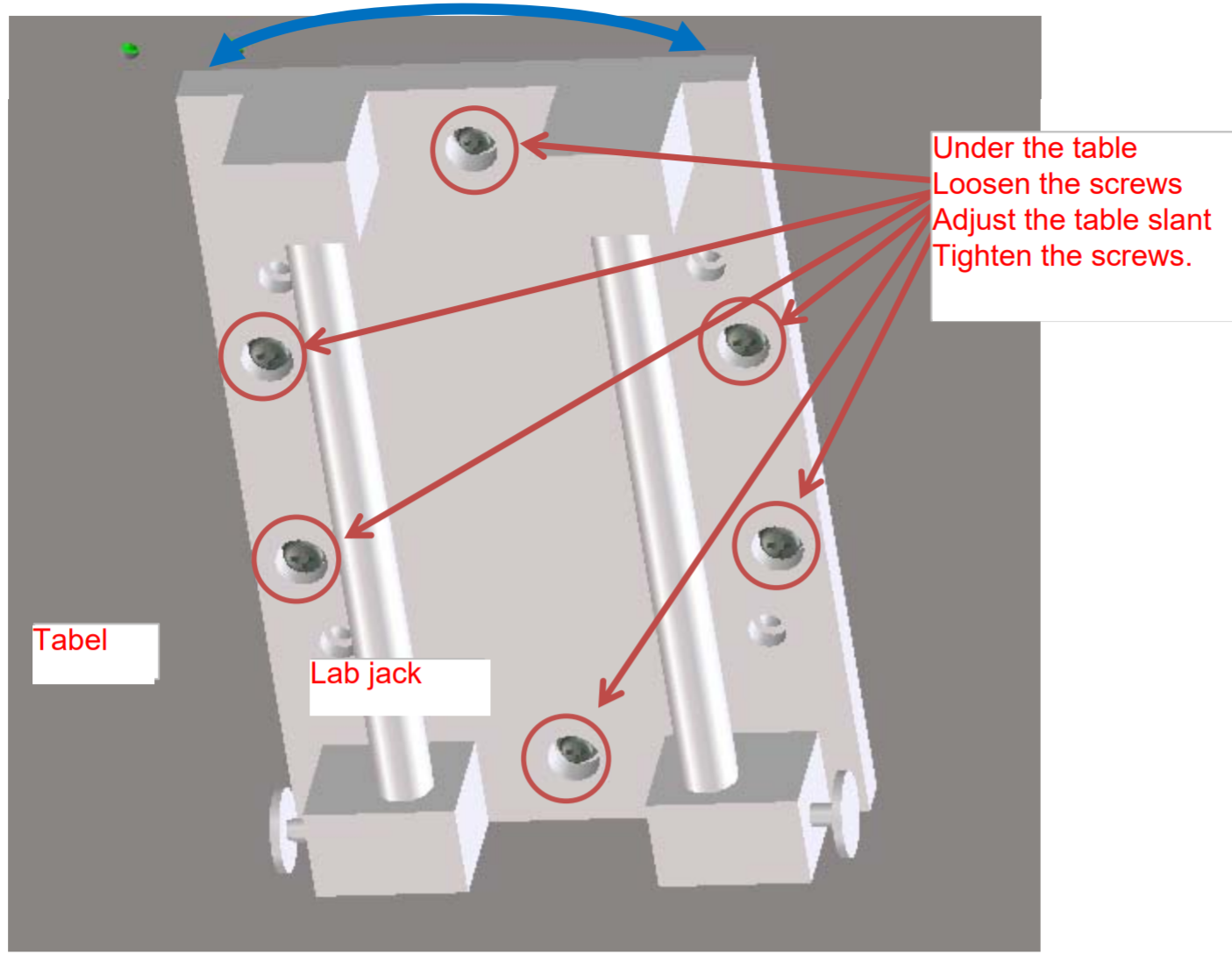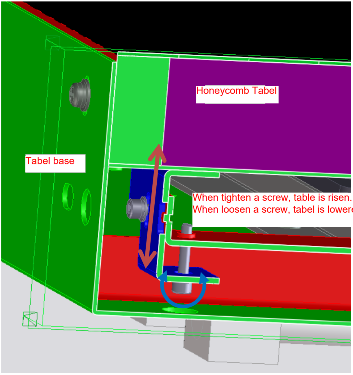The purpose of this adjustment is to ensure that the table-height is perfectly "equal" over the complete surface of the printing-table. If the table-height is not equal, please proceed as follow: