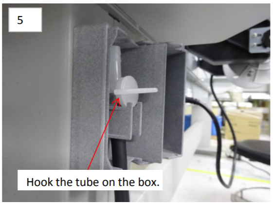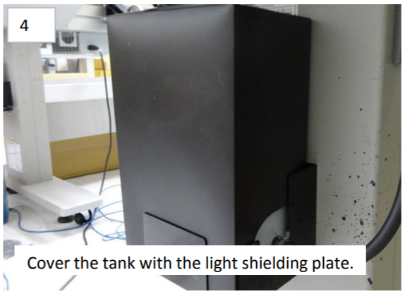 The new spare part assembly has a black tube with the tap on the outer end. The tap can then properly be positioned mounted vertically and light-tight in a small box in order to avoid to get in contact with environmental light and as well decrease the chance of leaking ink on the floor.