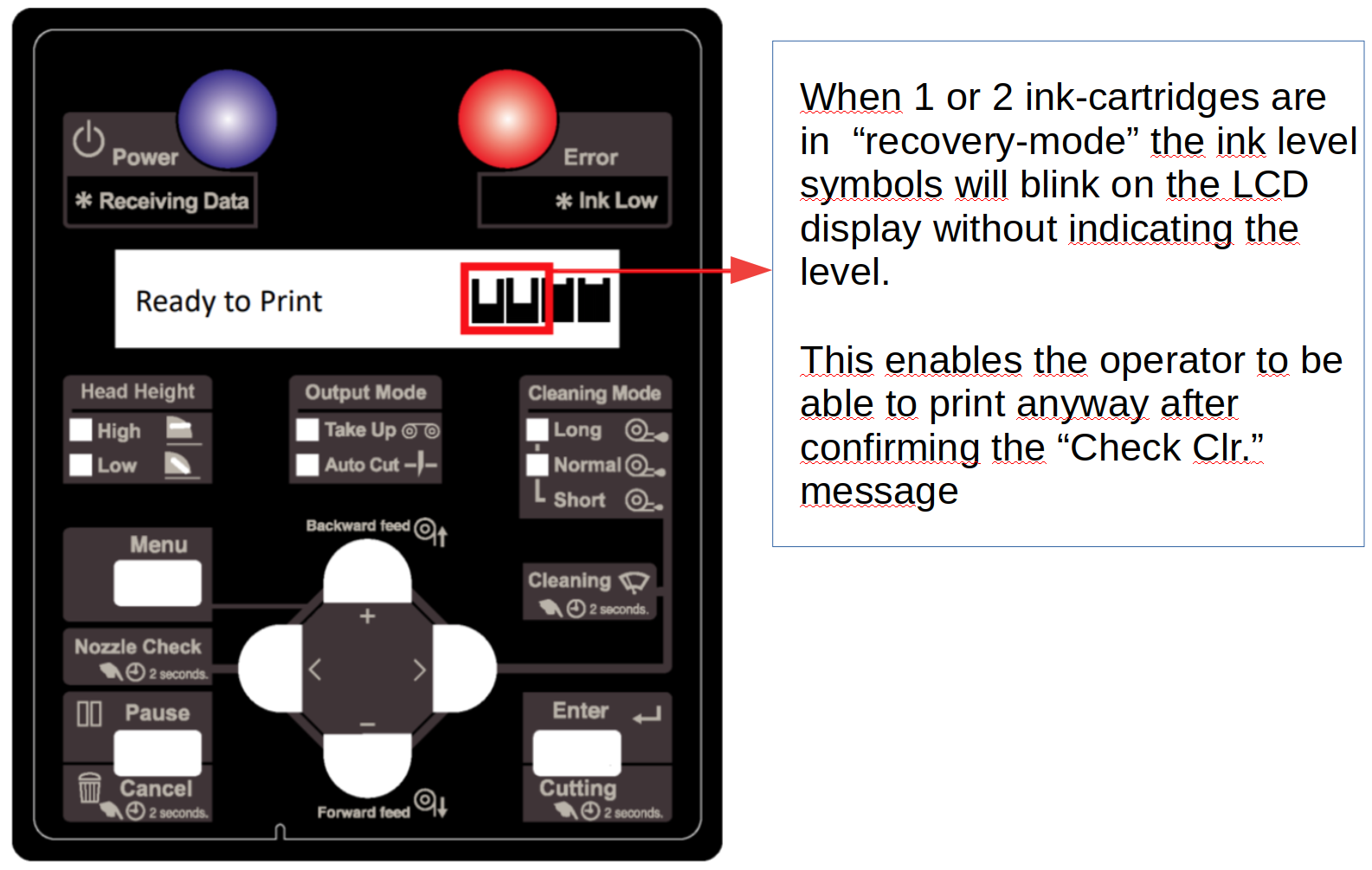 This new recovery method enables the customer to print anyway, despite having 1 (or more) smart-chip related error(s). If more than half the amount of ink-slots in the printer are having S/C errors, this procedure will not be possible. In that case a "Recog Err." will be displayed on the panel instead. In this case the printer will not be able to print and the operator has to check all his cartridges or something is technically (or electronically) wrong with the printer or the cartridge-readers: