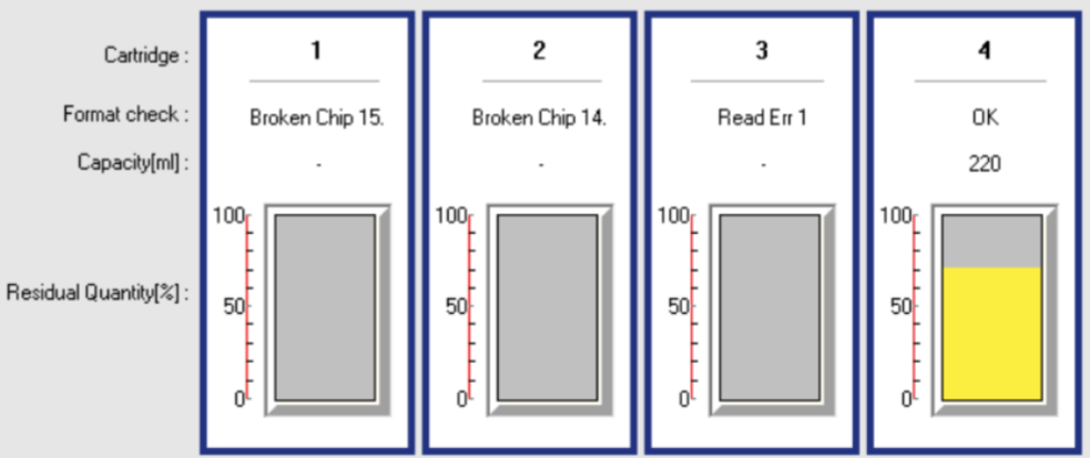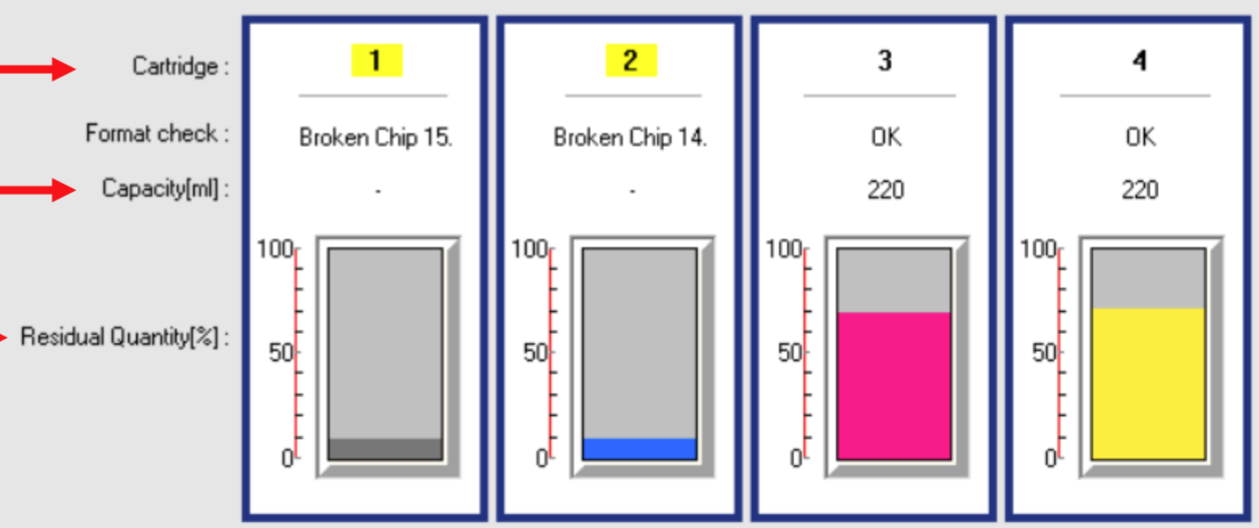 The MSM (Mutoh Status Monitor) will give a similar view, like on the LCD display, without variable ink level. The residual quantity on the recovered smartchip/cartridge will show 10%. This is a normal behaviour in this mode since the printer doesn't know any longer how much ink is in this cartridge.