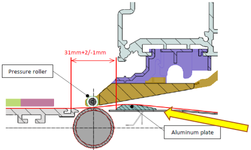 Mutoh Japan engineering investigated this in-depth.  To avoid the above occasional behavior, Mutoh R&D developed a “Media Control Kit”. This kit will enhance the media transport path. It consists of aluminum profiles, which are placed on the XpertJet’s rear platen just before the media is going under the pressure rollers. This extra thickness creates some tension in the media and inhibits cockles to arise.