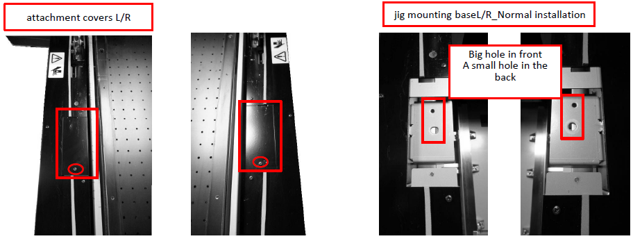 Sending a picture to illustrate the problem might help to assure the correct part is sent. If the 2 bases have been switched from place, as in example 3, then please re-install them in the correct location. In order to be able to change the “mounting base” the “side outer cover” needs to be removed. How to do this is explained in the maintenance manual.