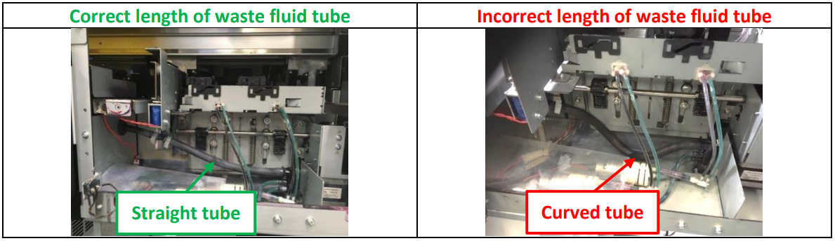 Over the course of time we have noticed that the waste fluid originating from the spitting box and the wiper assembly may possibly accumulate on these 2 units. Because the tube might be too long, old ink waste may deposit and block inside the curve of the tubing, which is connected to the waste manifold.