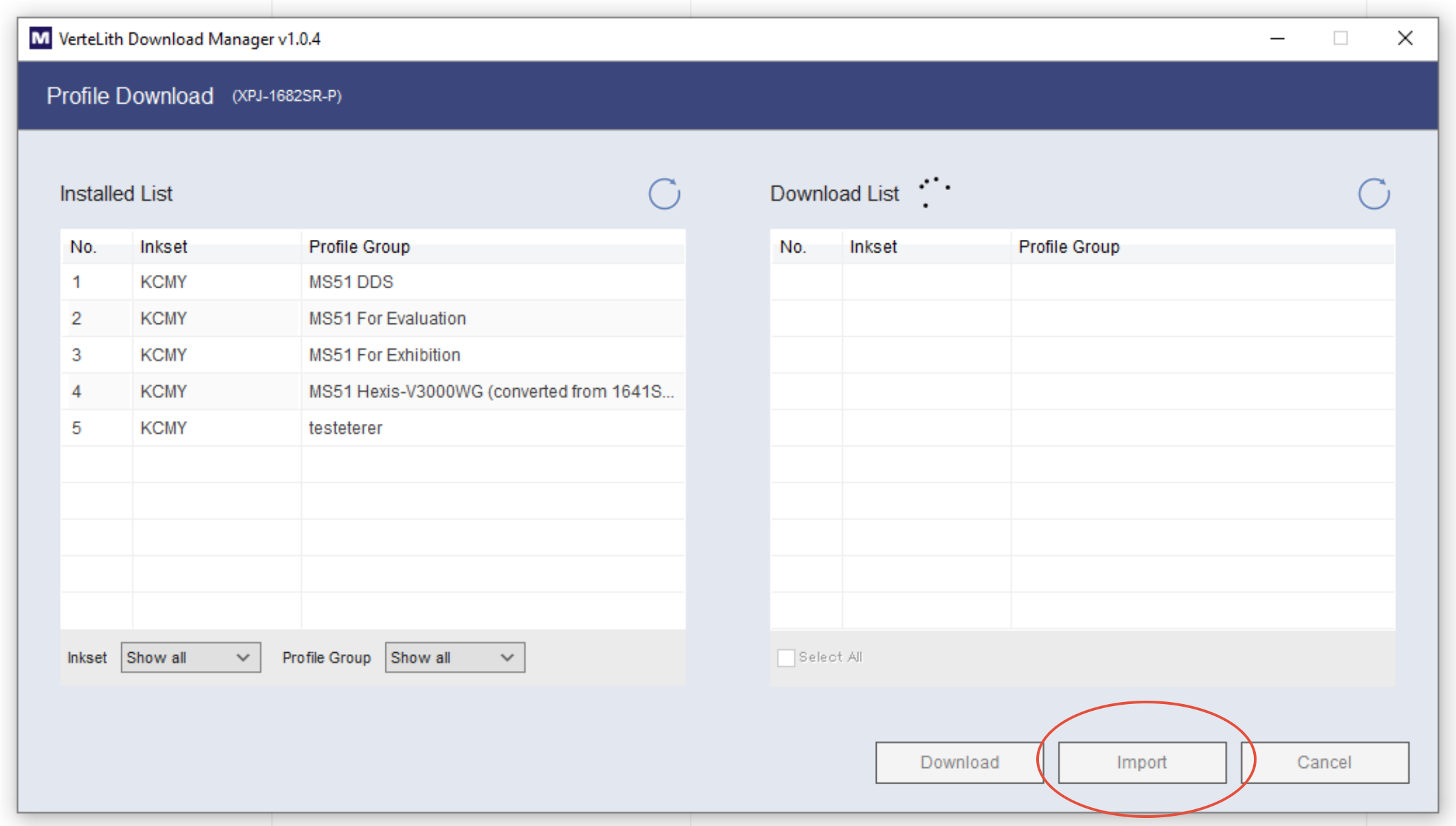 • The Download Manager will pop up and allows you to download profiles directly from the Mutoh Club into your driver.