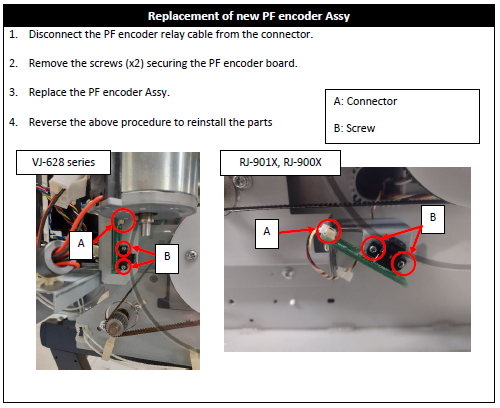 The PF encoders that were previously used on the models RJ-900X, VJ-628 and VJ-628MP have been discontinued and have been replaced by new part numbers.