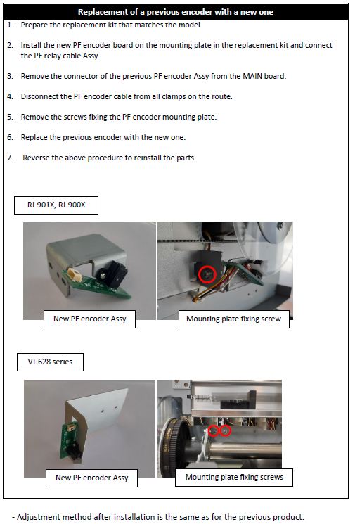 For VJ-628, VJ-628X, VJ-628D, VJ-628MP: DH-41129 (PF encoder board (DH-0770), PF encoder rely assy (DH-41126) and mounting plate + screws),