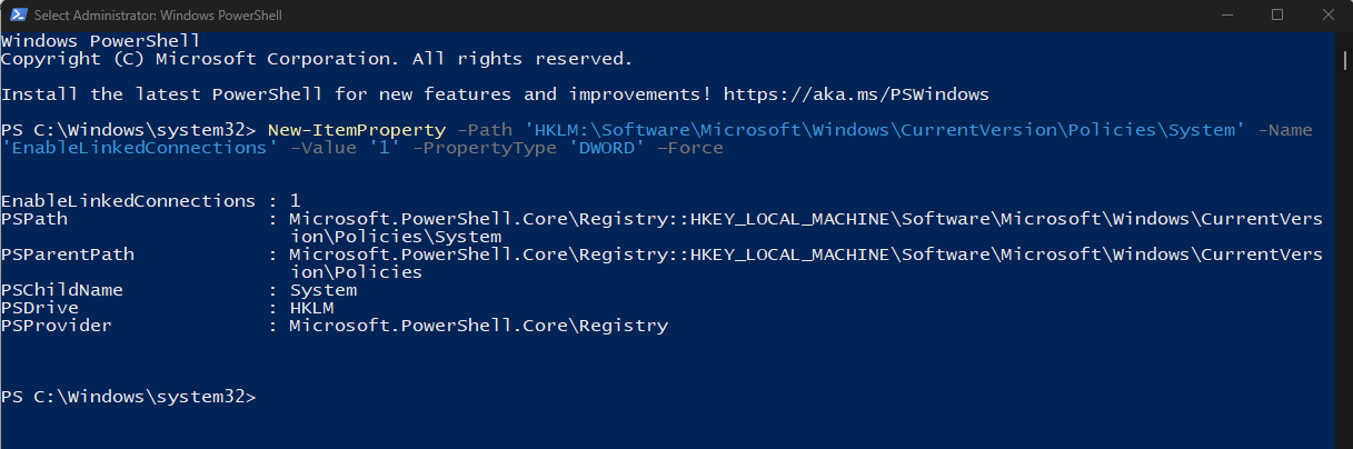 New-ItemProperty -Path 'HKLM:\Software\Microsoft\Windows\CurrentVersion\Policies\System' -Name 'EnableLinkedConnections' -Value '1' -PropertyType 'DWORD' –Force