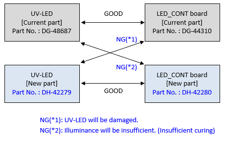Replacement kit: When a machine with an old version lamp or board needs a replacement to a new version for the first time, both lamps and boards will need to be replaced. For this purpose a kit has been defined: DH-42281 (UV-LED _3Inch replacement kit).