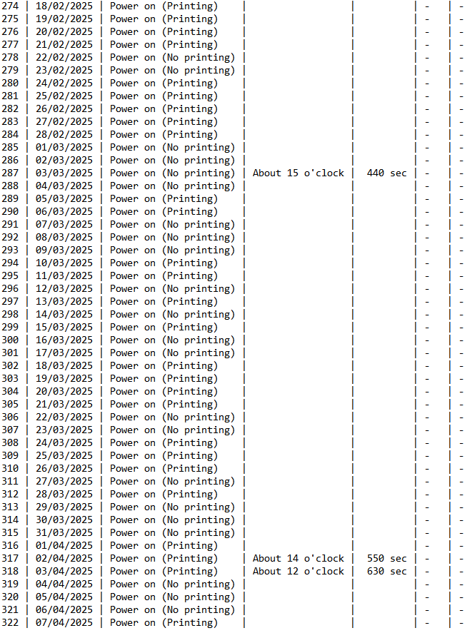This example file shows that the customer is not performing the maintenance properly as described. The maintenance should have been performed every day when the printer was used for printing, but this is not the case in this example