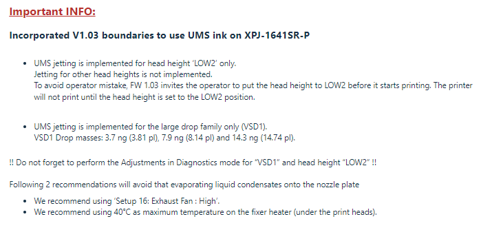 (2) The use of UMS ink is reserved to LOW2 head height in combination with VSD1.